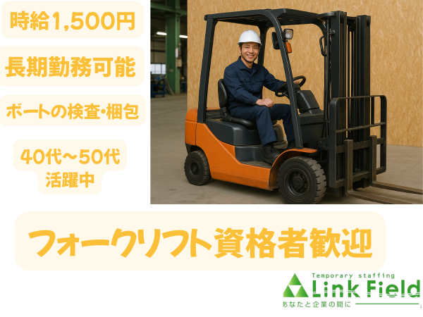 入社祝金あり! 時給1,500円 フォークリフト作業! トラック運搬! 工場経験者大歓迎! 未経験でも相談可能! 経験を生かせるお仕事!
